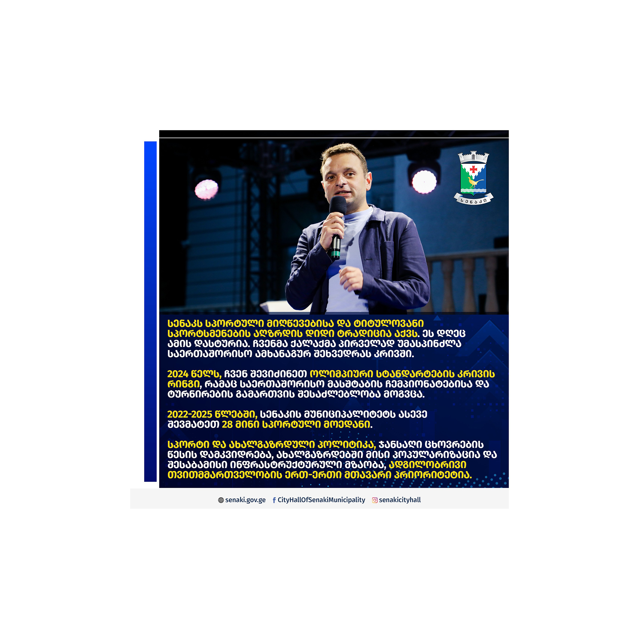 სენაკს სპორტული მიღწევებისა და ტიტულოვანი სპორტსმენების აღზრდის დიდი ტრადიცია აქვს. ეს დღეც ამის დასტურია. ჩვენმა ქალაქმა პირველად უმასპინძლა საერთაშორისო ამხანაგურ შეხვედრას კრივში. 2024 წელს, ჩვენ შევიძინეთ ოლიმპიური სტანდარტების კრივის რინგი, რამაც საერთაშორისო მასშტაბის ჩემპიონატებისა და ტურნირების გამართვის შესაძლებლობა მოგვცა. 2022-2025 წლებში, სენაკის მუნიციპალიტეტს ასევე შევმატეთ 28 მინი სპორტული მოედანი. სპორტი და ახალგაზრდული პოლიტიკა, ჯანსაღი ცხოვრების წესის დამკვიდრება, ახალგაზრდებში მისი პოპულარიზაცია და შესაბამისი ინფრასტრუქტურული მზაობა, ადგილობრივი თვითმმართველობის ერთ-ერთი მთავარი პრიორიტეტია.